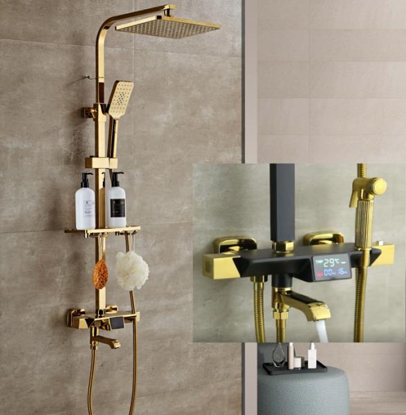 golden color copper rain shower multi-function intelligent electricity digital display bathroom shower faucet